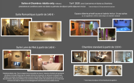 Les suites pour 2 personnes disposent d'une chambre, d'un salon, télévision à écran plat, un coffre-fort et un canapé installé à l'écart et une salle d'eau avec wc.Des peignoirs sont fournis. Le petit-déjeuner, vous sera servi en chambre. La suite comprend un accès de 1 heure à l'espace détente privé, balnéo et sauna. Une réservation préalable est nécessaire.